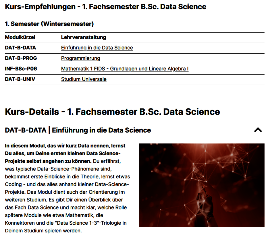 Die Studieninhalte des B.Sc. Data Science sind im Modulkatalog detailliert aufgelistet.