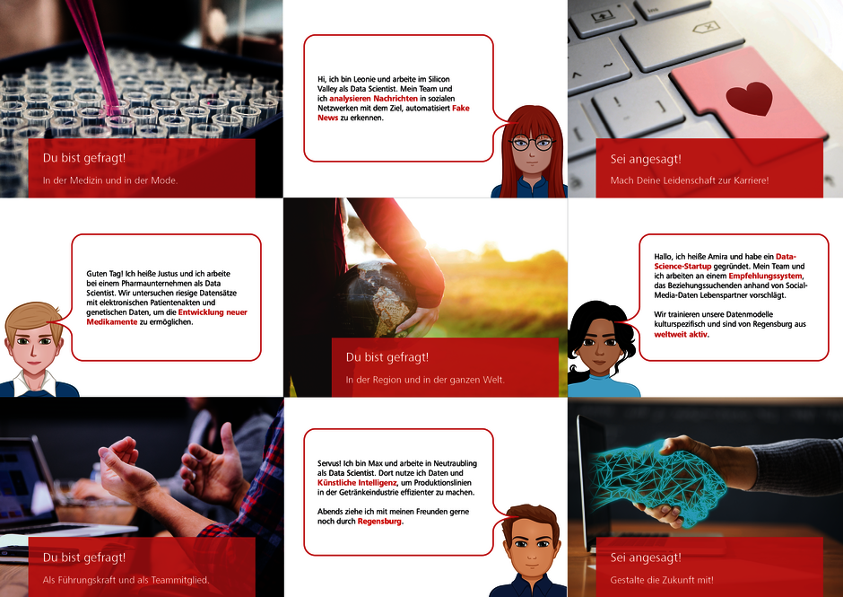 An der Universität Regensburg baut der gleichnamige M.Sc.-Studiengang „Data Science“ unmittelbar auf dem Bachelorstudium auf. Darüber hinaus bietet unsere Universität eine Vielzahl weiterer informatiknaher Masterstudiengänge an. Du kannst z. B. im Anschluss Computational Science studieren, wenn Du Dich besonders für Data Science in den Naturwissenschaften begeisterst, oder Human-Centred AI, falls Dich Sprachverarbeitung o. Ä. fasziniert. Auch Medien- und Wirtschaftsinformatik kommen infrage. Hast Du im Bachelor-Studium Deinen Schwerpunkt auf biomedizinische Forschungsthemen gelegt, kannst Du auch mit einem M.Sc.-Studium in molekularer Medizin oder Biochemie fortfahren. Ein Fokus auf Wirtschaftswissenschaften macht auch ein M.Sc.-Studium in Volks- oder Betriebswirtschaftslehre möglich.