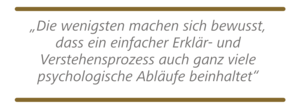 C.K.: Wir haben einerseits das psychologische, theoretische Wissen, welche psychologischen Mechanismen existieren im Menschen an sich. Aber dass man dann im Alltag mit diesen theoretischen „Brillen“ auf Individuen gucken muss, welche Emotion genau in welcher Situation auf welchen Reiz hin ausgelöst wird, das ist eine völlig andere Art von Wissen. Das ist erfahrungsbezogenes, biografisches oder auf das individuum bezogenes Wissen. Und dass das qualitativ zwei völlig verschiedene Arten von Wissen sind, die ich aufbauen muss bei einem Theorie-Praxis-Transfer, das ist, denke ich, eine wirklich spannende Erkenntnis.