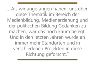 C.G.: Als wir angefangen haben, uns über diese Thematik im Bereich der Medienbildung, Medienerziehung und der politischen Bildung Gedanken zu machen, war das noch kaum belegt. Und in den letzten Jahren wurde an immer mehr Standorten und in verschiedenen Projekten in diese Richtung geforscht. Die Vernetzung mit den anderen Projekten, der Austausch, waren etwas, wo wir selber auch unheimlich viel dazugelernt haben. Das hat uns auf jeden Fall nach vorne gebracht und hat uns gezeigt, dass wir auf ein wichtiges Thema gesetzt haben.