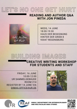 ![]() | Jon PinedaREAF, together with DIMAS, was honored to be part of two events with Jon Pineda, invited and chaired by the Interim Chair of American Studies at UR, Prof. Dr. Julia Faisst. Pineda is a 2022 Virginia Center for the Creative Arts fellow and faculty member in the MFA program at Queens University of Charlotte. He has taught in their Latin America MFA program in Rio de Janeiro and in Buenos Aires. During his visit to the UR, Pineda read from his latest novel, Let's No One Get Hurt, on Wednesday, 14 June 2023. On Friday, 16 June, Jon Pineda led a Creative Writing Workshop for students and staff of the UR. |