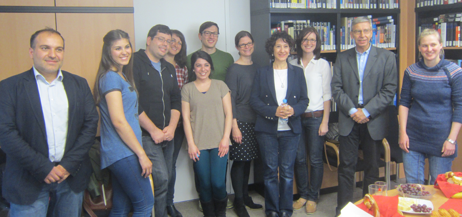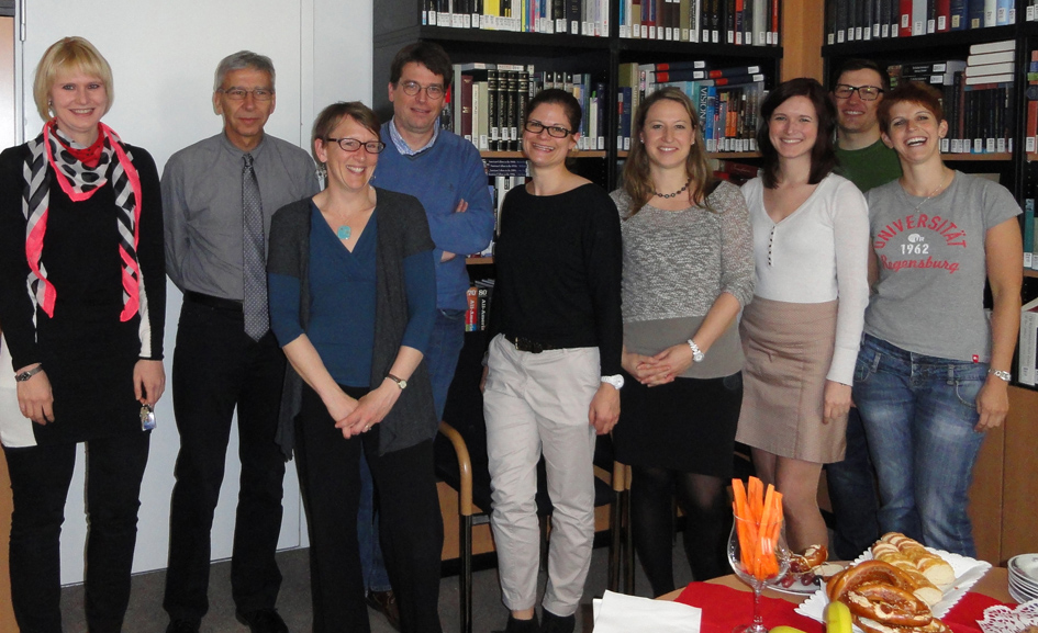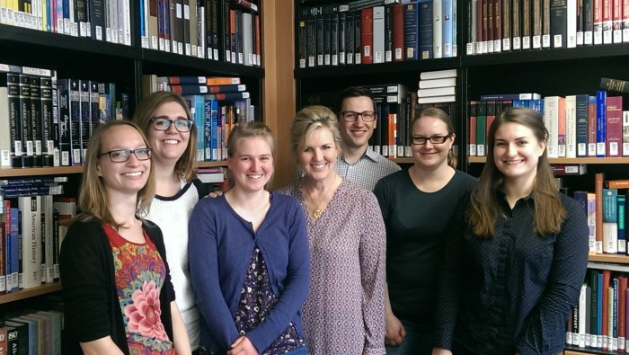 | Prof. Dr. Nina Morgan visited Regensburg American Studies as a REAF Fellow for ten days in April/May 2016. We enjoyed the following events: "Symposium: American Studies Transnational: Perspectives, Politics, Responsibilities" (30 April 2016, 5-7 pm, Altes Finanzamt); "Research Roundtable: Projects in Transnational American Studies" (3 May 2016, 4-6 pm, PT 3.2.73); "Bartleby, the Slacktivist; Citizen-Saboteurs; and Other 'Occupations'" (Lecture and Q&A Session; 4 May 2016, 2-3 pm & 3-4 pm, ZH 5). Thank you, Professor Morgan for insightful talks, productive discussions, and most valuable support for our graduate students! Professor Morgan's visit to Regensburg was made possible by the friendly support of: Hans Vielberth University Foundation. Image: Prof. Morgan meets UR American Studies graduate students and PhD candidates.