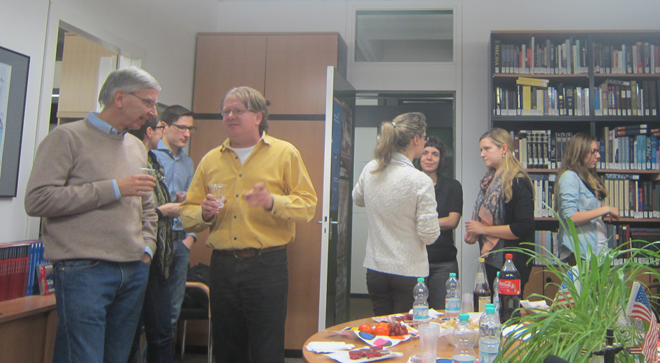 ![]() | Semester Opening 2014: Prof. Dr. Udo Hebel and American Studies graduate students Tina Flemmerer and Imani Wadud welcome the new American Studies graduate students to Regensburg. At the Haus der Begegnung, a historic downtown venue, Regensburg’s new American Studies graduate students discuss a presentation by former grad student Claudia Trotzke and meet Regensburg American Studies faculty and fellow graduate students. --> |