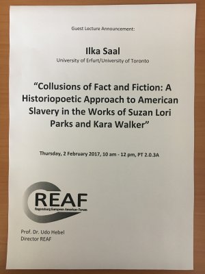 | Prof. Dr. Ilka Saal of the University of Erfurt visited the University of Regensburg on 2 February 2017. On this day the Professor held a guest lecture titled "Collusions of Fact and Fiction: A Historiopoetic Approach to American Slavery in the Works of Suzan Lori Parks and Kara Walker." | |