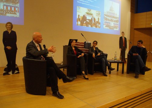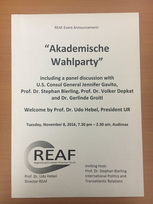 | On 8 November 2016, the day of the U.S. Presidential and Congressional Election, Prof. Dr. Stephan Bierling will hosted an academic election party at the University of Regensburg. This event included a panel discussion between U.S. Consul General Jennifer Gavito, Prof. Dr. Stephan Bierling, Prof. Dr. Volker Depkat, Prof. Dr. Udo Hebel and Dr. Gerlinde Groitl. Furthermore, there was a live TV broadcast following the panel discussion, as well as a discussion about the results of the U.S. election. --> | |