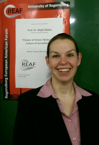 | Prof. Dr. Birgit Däwes, Europa-Universität Flensburg, visited REAF on 1 February 2016. Regensburg American Studies faculty and graduate students enjoyed her engaging lecture on "Flickers of Vision: Notes on the Culture of Surveillance.