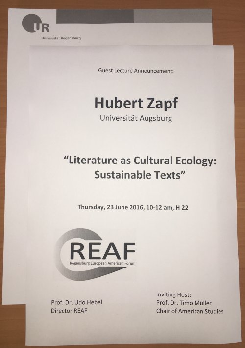 | Prof. Dr. Hubert Zapf of the University of Augsburg visited the University of Regensburg on 23 June 2016 to hold an intriguing talk titled "Literature as Cultural Ecology: Sustainable Texts." He came to Regensburg upon invitation by Prof. Dr. Timo Müller.