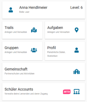 Nach der Anmeldung erhalten Sie über den Menüpunkt „Portal“ Zugriff auf bestehende Aufgaben, Trails und auch den Zugriff, um selbst etwas zu gestalten. Die Oberfläche sollte nun aussehen, wie in der Abbildung.