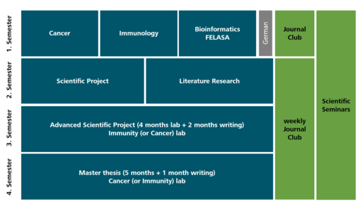 The students will get profound knowledge about current research in the field of cancer research as well as of immunology and will have the opportunity to perform two half-year long internships in two different research laboratories.