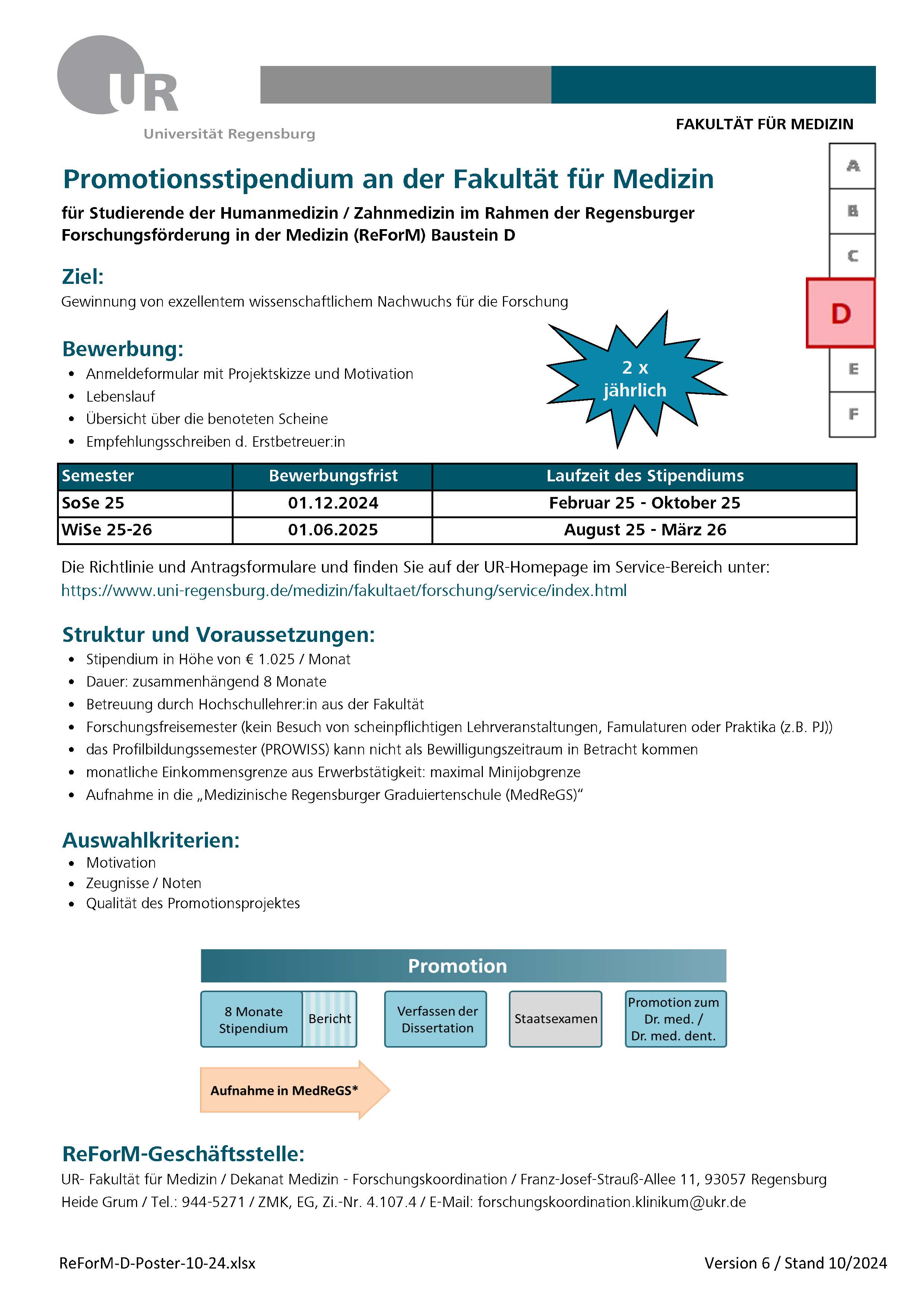 The doctoral scholarships are part of the ReForM Programme of the Faculty of Medicine at the University of Regensburg. The ReForM Module D promotes particularly talented students of human medicine and dentistry with a doctoral scholarship. Awarding this funding aims at the recruitment of excellent young scientists for research. Particularly motivated and excellent students of human medicine or dentistry are to be supported in the realisation of outstanding doctoral theses through a grant towards their living expenses.The award of the scholarship enables the completion of a structured doctoral programme.