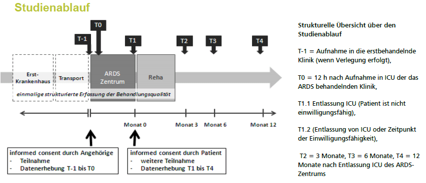 Das Protokoll der DACAPO-Studie bildet insbesondere den Studienablauf ab und gibt Antwort auf die Frage wann welche Daten erhoben werden. Im Verlauf der Studie werden Patientendaten (sozio-ökonomischer Status, klinische Parameter, psychosoziale Charakteristika) und Merkmale zur Versorgungsqualität (erstversorgendes Krankenhaus, Interhospitaltransport, ARDS-Zentrum, stationäre Rehabilitation) gesammelt und ermittelt.