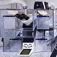 Dieses konfokale Laser Scanning Mikroskop TCS SP5 ermöglicht eine Vielzahl von zellbiologischen Auswerteverfahren in hoher Auflösung in einem S2-Labor.