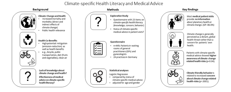 Die Mehrheit der Routine-Aufklärungsgespräche von Ärzt*innen (86,6 % in hausärztlichen Praxen, 84,5 % von Gynäkolog*innen) enthielten keine Informationen über planetare Gesundheit. Darüber hinaus zeigten die Ergebnisse, dass der Klimawandel eher als globale Gesundheitsbedrohung (84,3%) als eine Sorge für die eigene Gesundheit (66,4%) gesehen wird. Eine Beratung zu planetarer Gesundheit durch Ärzt*innen hat ein hohes Potenzial: Die beratenen Patienten zeigten höheres Wissen und Bewusstsein über Gesundheitsrisiken im Zusammenhang mit dem Klimawandel (p=0,002) sowie emotionale Betroffenheit (p=0,04). Klimafreundliches Verhalten ist mit emotionaler Betroffenheit über die eigenen Gesundheitsrisiken bedingt durch den Klimawandel verbunden (Verringerung psychologischer Distanz).