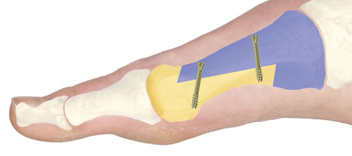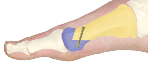 Bei stärkerer Fehlstellung wird die Operation nach Scarf angewendet. Durch den über eine lange Strecke verlaufenden Sägeschnitt ist das Korrekturpotential größer, die langflächige knöcherne Kontaktstrecke bietet eine gute Voraussetzung für eine optimale Knochenheilung. Bei der basisnahen Umstellung erfolgt eine Neuausrichtung der Achse des ersten Strahls im Bereich der Basis des Mittelfußknochens.