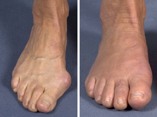 Patientin mit ausgeprägter Ballenzehe vor und 40 Tage nach Operation