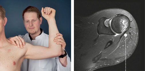 Rechts: Die Kernspintomographie zeigt die Schwellung im Knochen und den eingedrückten Oberarmkopf, die sogenannte Hill-Sachs-Delle.
