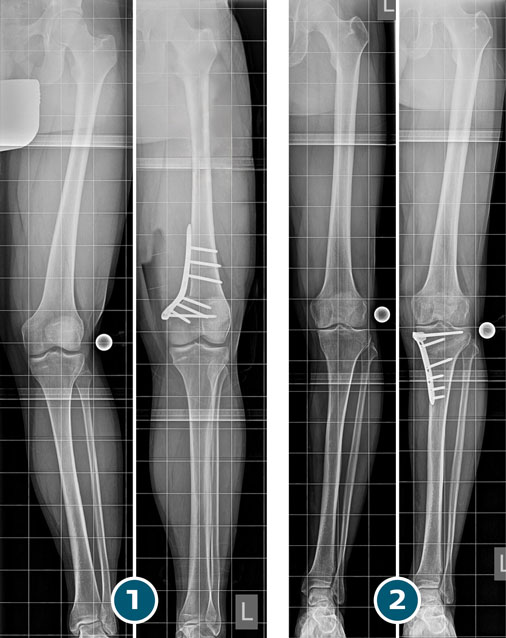 Beinachsenkorrektur durch Umstellungsosteotomie: Röntgenaufnahmen vor und nach der OP bei einem X-Bein (1) und einem O-Bein (2).