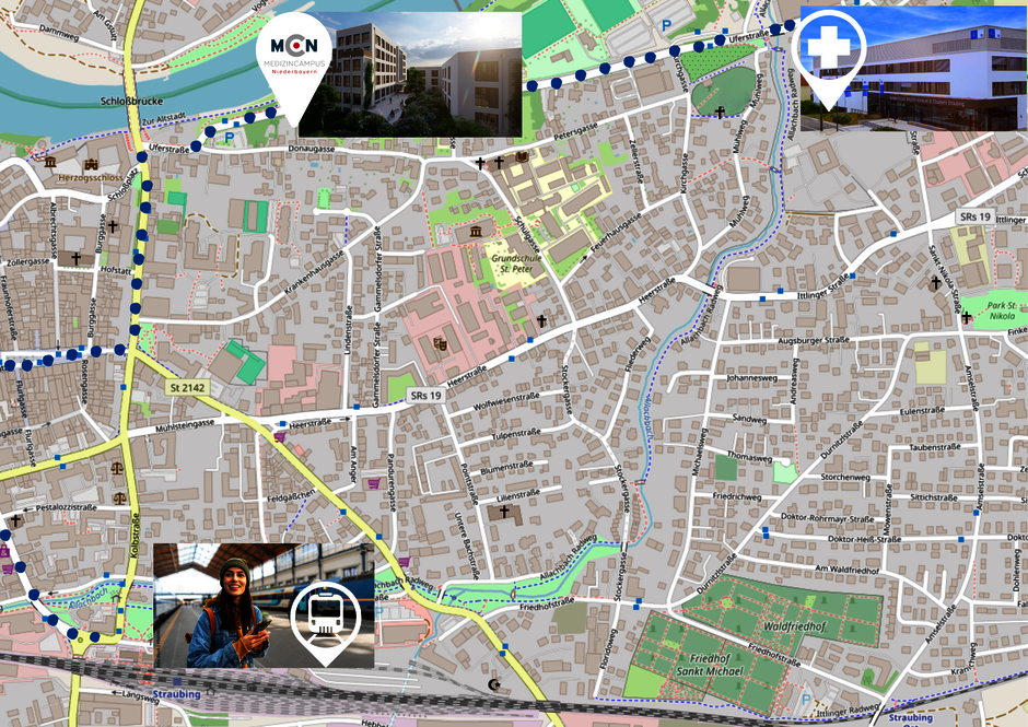 Von Vorteil ist Straubings zentrale Lage: Mit Regensburg (43 Kilometer), München (140 Kilometer) und Passau (85 Kilometer) liegen attraktive Großstädte in der Nähe. Mit der Deutschen Bahn erreichen Sie Regensburg in nur rund 24–30 Minuten. Dank der Anbindung an den Regensburger Verkehrsverbund (RVV) ist dafür kein zusätzliches Ticket notwendig. Die Züge verkehren von Montag bis Freitag regelmäßig im Stundentakt – in den Hauptzeiten meist alle 30 bis 60 Minuten, von frühmorgens bis spätabends. Ein Umzug ist also nicht nötig. In Straubing selbst lassen sich dank kurzer Wege die meisten Ziele bequem zu Fuß oder mit dem Fahrrad erreichen; zudem ist das Klinikum mit den Stadtbussen über Linie 4 sehr gut an den Bahnhof angebunden. Die Busfahrt zwischen Bahnhof und Klinikum über MCN dauert nur ca. 10 Minuten. Busse verkehren regelmäßig 1-3 Mal pro Stunde von morgens bis abends.