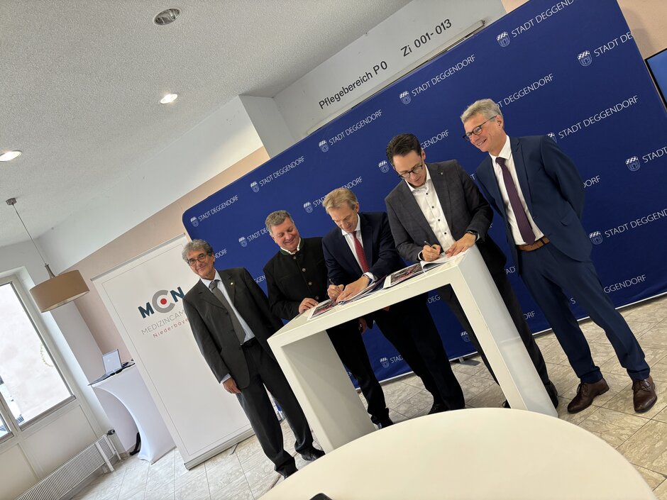 Am 10.10.2025 konnte der Vertrag für die Anmietungen des MCN-Gebäudes am MCN-Standort Deggendorf unterzeichnet werden. Nach Straubing, Passau und Mainkofen ist dies nun das vierte Gebäude, das für den MedizinCampus Niederbayern angemietet wird. Im ehemaligen Elisabethenheim, das sich besonders durch die Nähe zum DonauIsarKlinikum als Standort für den MCN anbietet, sollen bis Anfang 2027 sowohl Lehr- und Lernflächen sowie Arbeits- und Aufenthaltsräume für die Studierenden entstehen als auch Büroflächen für die Mitarbeitenden des MCN am MCN-Standort Deggendorf. Mit der Vertragsunterzeichnung in Deggendorf erreicht der MCN einen weiteren wichtigen Meilenstein auf dem Weg seiner Umsetzung.