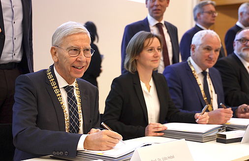 Prof. Dr. Ernst Tamm, Leiter der Task Force MCN und Vizepräsident für Forschung und Nachwuchsförderung an der Universität Regensburg erläuterte das Satellitenmodell des Medizinstudiums, welches drei Jahre in Regensburg und dann drei Jahre vornehmlich in den Klinika Niederbayerns stattfinden wird. Die Professor*innen der niederbayrischen Klinika werden Mitglieder der Fakultät für Medizin der Universität Regensburg. Er verwies darauf, dass ein Medizinstudium sechs Jahre dauert, die Facharztausbildung für Allgemeinmedizin weitere fünf Jahre. Das heißt, dass sich erst in 11 Jahren im MCN ausgebildete Mediziner in der Region niederlassen werden. „Wir haben daher keine Zeit zu verlieren und es ist sehr gut, dass die heutige Unterzeichnung uns die Möglichkeit gibt, im WS 2024 mit dem Studium zu beginnen“, zeigt sich Tamm zuversichtlich.