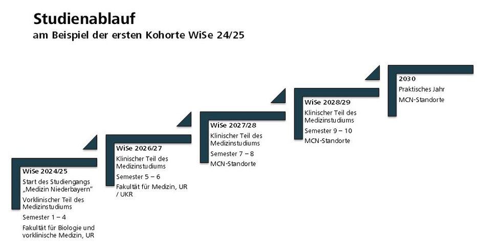 Die Besonderheit des Studiums liegt darin, dass Sie nach dem sechsten Fachsemester an einen unserer niederbayerischen MCN-Standorte wechseln: Deggendorf / Mainkofen, Passau, Landshut oder Straubing.