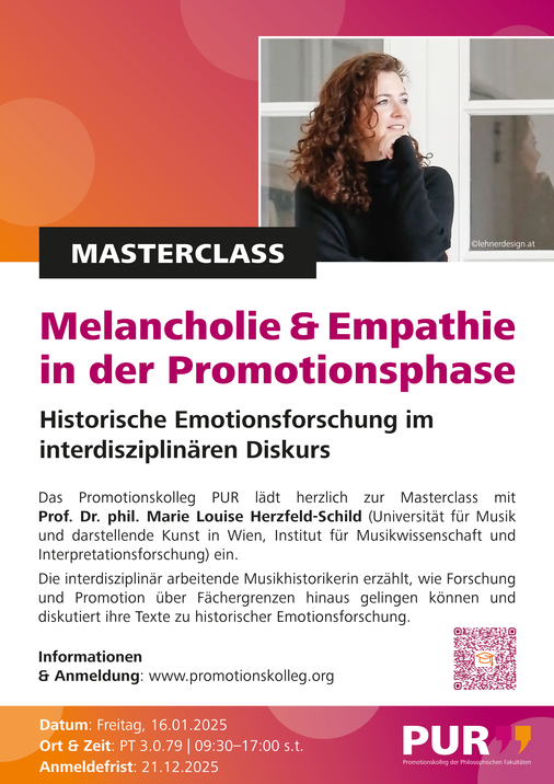 Wir laden interessierte Doktorand:innen und Postdocs ganz herzlich zu ihrer Masterclass zum Thema „Melancholie und Empathie in der Promotionsphase. Historische Emotionsforschung im interdisziplinären Diskurs“ ein. Die Veranstaltung findet am Freitag, d. 16. Januar 2026 im großen Sitzungssaal (PT 3.0.79) von 09:30 bis 17:00 Uhr statt.