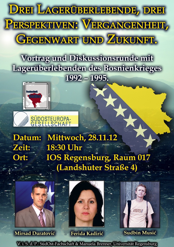 - 28.11. Sonderveranstaltung in Kooperation mit Manuela Brenner (Mitarbeiterin am Lehrstuhl für Geschichte Südost- und Osteuropas, Regensburg): Drei Lagerüberlebende, drei Perspektiven: Vergangenheit, Gegenwart und Zukunft. – Vortrag und Diskussionsrunde mit Lagerüberlebenden des Bosnienkrieges 1992 – 1995. Achtung: Die Veranstaltung findet im WiOS (Landshuter Str. 4), Raum 017, Beginn 18.30 Uhr, statt.