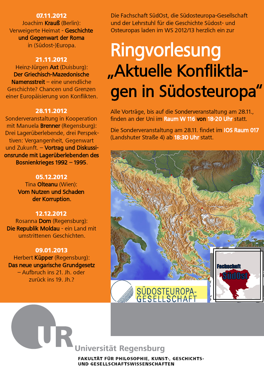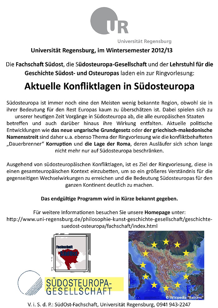 Die Fachschaft wird im Wintersemester 2012/13 gemeinsam mit der Südosteuropa-Gesellschaft und dem Lehrstuhl für die Geschichte Südost- und Osteuropas an der Universität Regensburg eine Ringvorlesung zum Thema "Aktuelle Konfliktlagen in Südosteuropa" veranstalten.