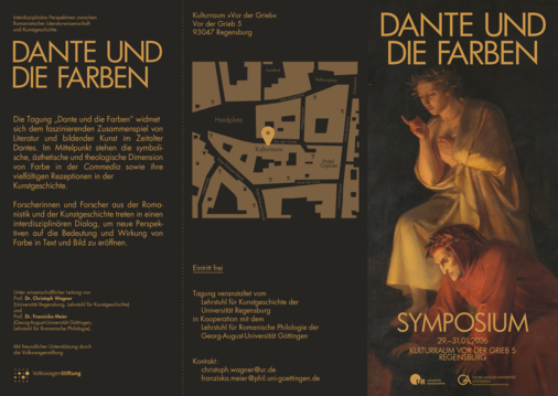 Die Tagung „Dante und die Farben“ widmet sich dem faszinierenden Zusammenspiel von Literatur und bildender Kunst im Zeitalter Dantes. Im Mittelpunkt stehen die symbolische, ästhetische und theologische Dimension von Farbe in der Commedia sowie ihre vielfältigen Rezeptionen in der Kunstgeschichte. Forscherinnen und Forscher aus der Romanistik und der Kunstgeschichte treten in einen interdisziplinären Dialog, um neue Perspektiven auf die Bedeutung und Wirkung von Farbe in Text und Bild zu eröffnen.