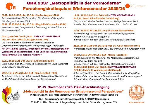 Das Programm der Tagung "Metropolität in der Vormoderne. Ergebnisse und Perspektiven" blickt bilanzierend auf die Forschungsergebnisse des interdisziplinären Graduiertenkollegs und verortet diese im größeren nationalen und internationalen Forschungsdiskurs zu Metropolen, ihrer Urbanität, Zentralität und Geschichtlichkeit. In sieben thematischen Panels werden die Graduiertenprojekte diskutiert und mit Beiträgen der PIs der Universität Regensburg und Vorträgen von nationalen und internationalen Expert:innen flankiert.