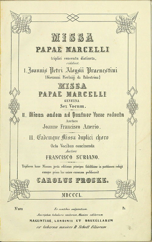 Bereits 1850 legte Proske eine Edition von Palestrinas heute berühmtester Messe vor: die Missa Papae Marcelli (Hörbeispiel). Sie galt im 19. Jahrhundert als Höhepunkt einer langen Entwicklung der Vokalpolyphonie aufgrund von Klarheit, Wohlklang und einer perfekten Balance zwischen Kunstfertigkeit und Textverständlichkeit. Proskes Ausgabe enthält das Werk in drei Fassungen: die sechsstimmige Originalversion Palestrinas, die vierstimmige Bearbeitung von Giovanni Anerio (1569–1630) und die achtstimmige Fassung von Francesco Soriano (1548/49–1621).