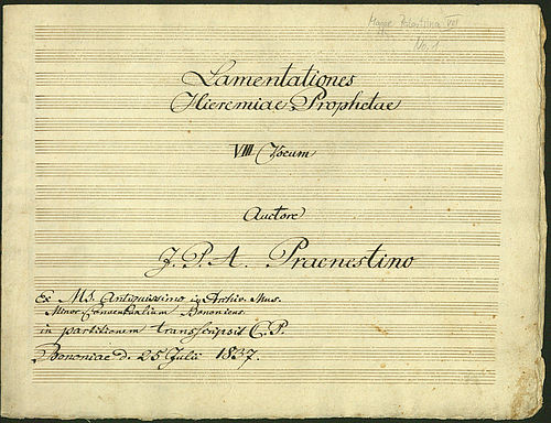 Diese Palestrina zugeschriebenen achtstimmigen Lamentationen spartierte Carl Proske 1837 im Minoritenkonvent in Bologna. Die Komposition ist heute nur noch in Proskes Abschrift erhalten. Sie gehört zum Stammrepertoire des Regensburger Domchors und wird jährlich am Gründonnerstag gesungen.