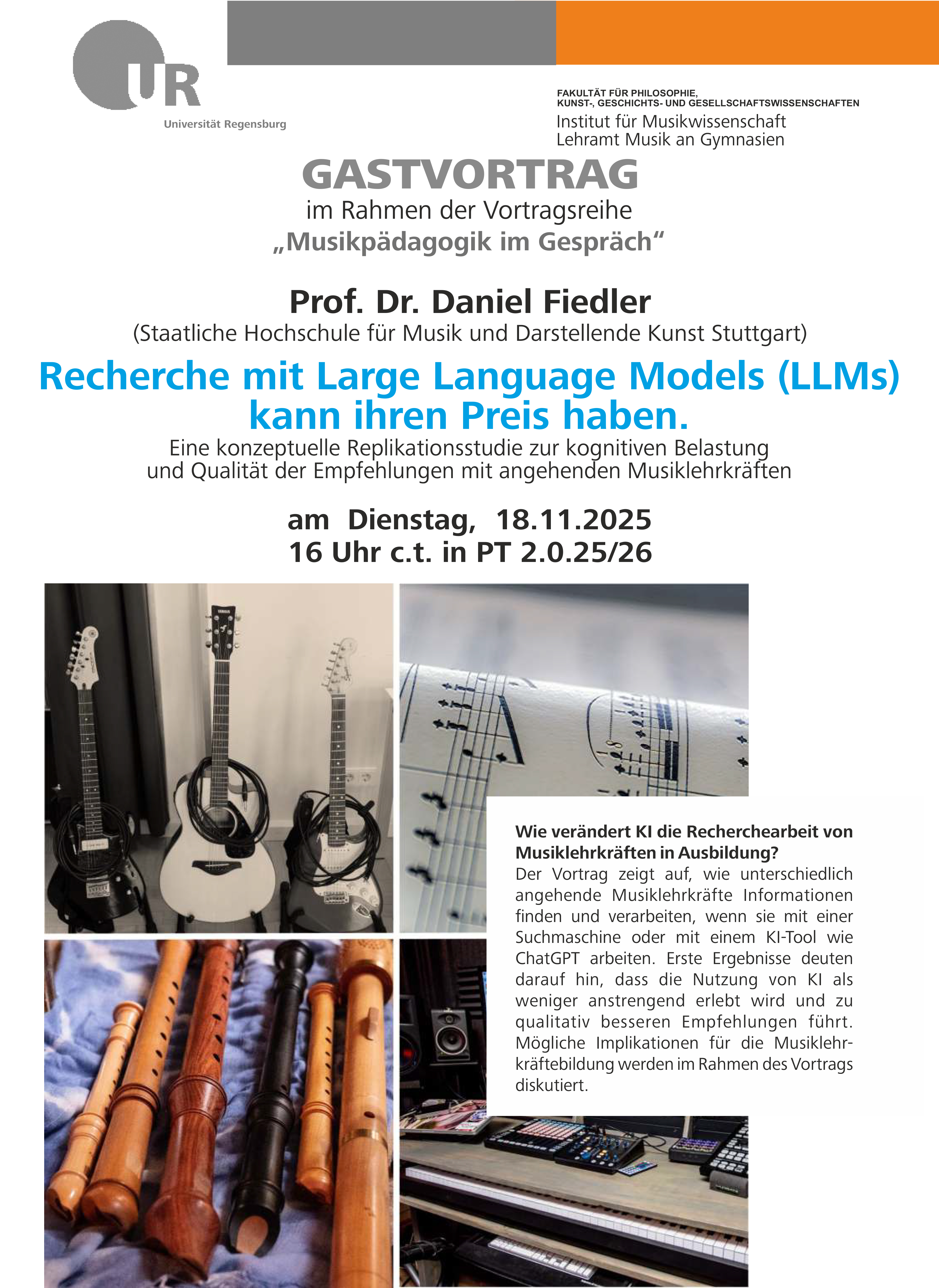 Gastvortrag Dr. Daniel Fiedler (Friedrich-Alexander-Universität Erlangen-Nürnberg), „Recherche mit Large Language Models (LLMs) kann seinen Preis haben: Eine konzeptuelle Replikationsstudie zur kognitiven Anstrengung und Qualität der Empfehlungen mit angehenden Musiklehrkräften“ – im Rahmen der Vortragsreihe „Musikpädagogik im Gespräch“
