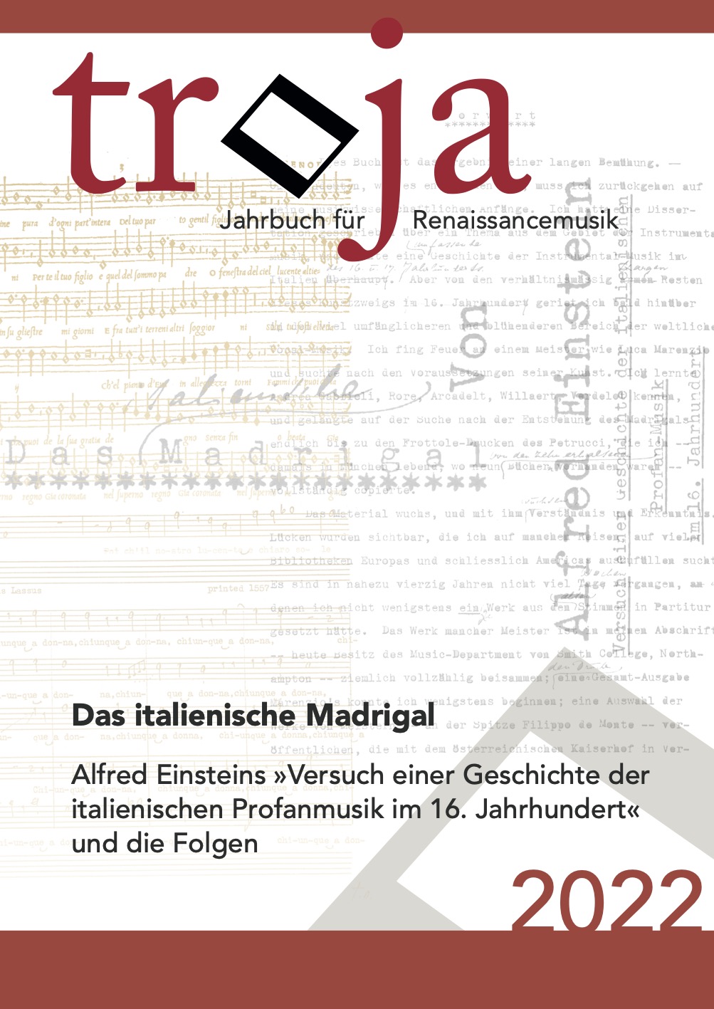 Sebastian Bolz, Moritz Kelber und Katelijne Schiltz (Hrsgg.), Das italienische Madrigal. Alfred Einsteins "Versuch einer Geschichte der italienischen Profan-Musik im 16. Jahrhundert" und die Folgen (= troja - Jahrbuch für Renaissancemusik 20), 2025.