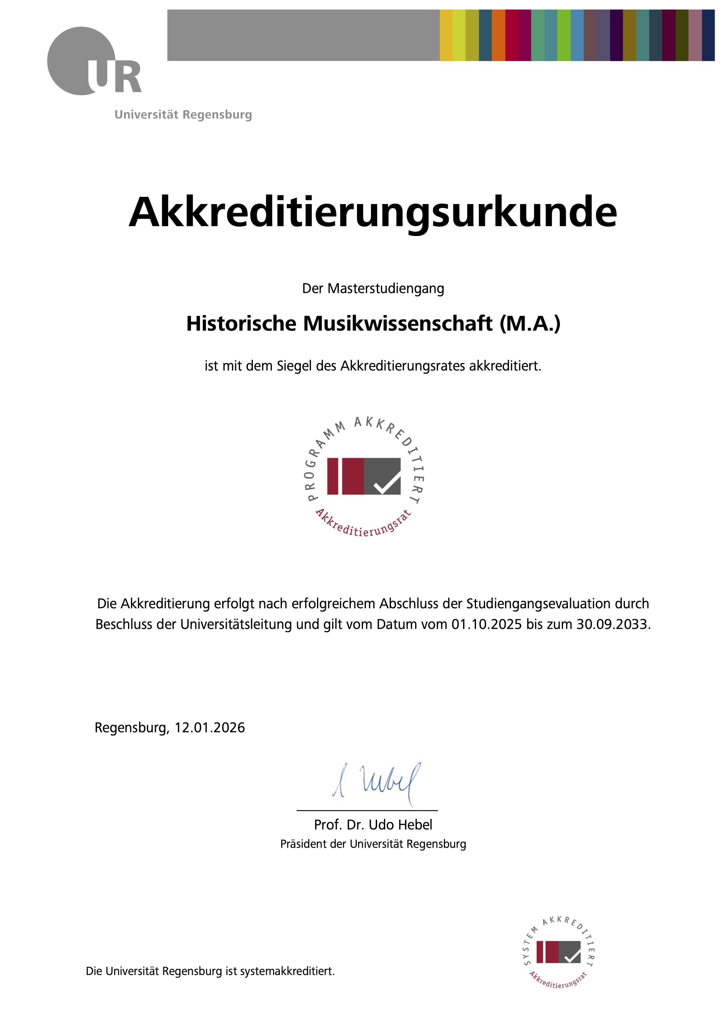Die Reakkreditierung bestätigt die hohe fachliche Qualität, die klare Studienstruktur sowie die kontinuierliche Weiterentwicklung unserer Lehrangebote am Institut für Musikwissenschaft der Universität Regensburg.