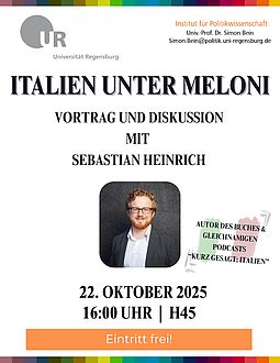 Drei Jahre Italien unter Meloni: Wie hat sich die Demokratie verändert? Was kennzeichnet das politische, soziale und kulturelle Klima Italiens unter der Regierung der Fratelli d'Italia? Zu Beginn des Wintersemesters findet am 22. Oktober um 16 Uhr in H45 eine öffentliche Veranstaltung mit Diskussion zum Thema statt. Alle Interessierten sind herzlich eingeladen. Der Gast ist Sebastian Heinrich, Autor des Podcasts und gleichnamigen Buches Kurz gesagt: Italien sowie Alumni der Uni Regensburg. Rückfragen bitte an Simon Bein, Lehrstuhl für Vergleichende Politikwissenschaft (Schwerpunkt Europa) richten.