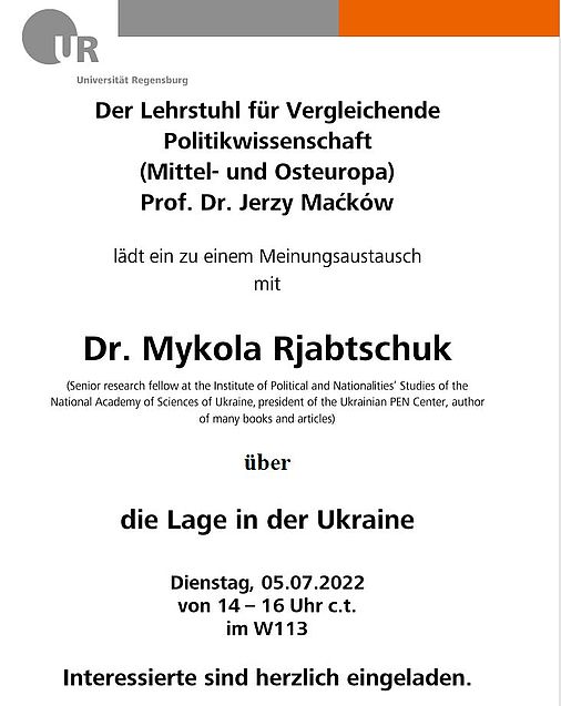 Zudem besteht am 05.07.2022 die Möglichkeit zu einem Meinungsaustausch mit Mykola Rjabtschuk über die Lage in der Ukraine. Alle Interessierten sind herzlich willkommen.