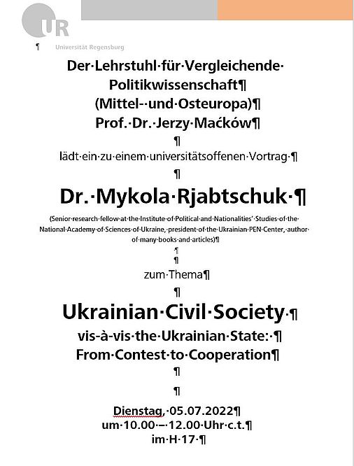 Am Dienstag, den 05.07.2022 lädt der Lehrstuhl zu einem universitätsoffenen Vortrag von Mykola Rjabtschuk ein zu dem Thema: Ukrainian Civil Society vis-à-vis the Ukrainian State: From Contest to Cooperation