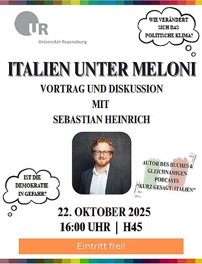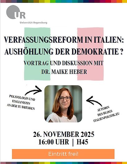 Zu Beginn des Wintersemesters 2025/2026 werden vom Lehrstuhl für Vergleichende Politikwissenschaft zwei Gastvorträge im Rahmen der Übung "Das politische System Italiens" organisiert. Alle Interessierten sind herzlich willkommen! Fragen bitte an Simon.Bein@politik.uni-regensburg.de richten.
