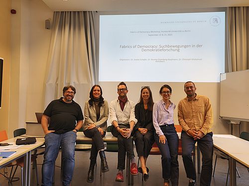 Am 22. und 23. September war Simon Bein an der HU Berlin auf einem Workshop des Netzwerkes Fabrics of Democracy. Zusammen mit Norma Osterberg-Kaufmann, Saskia Schäfer (beide HU Berlin), Vanessa Boese-Schlosser (WZB), Christoph Mohamad-Klotzbach (Uni Würzburg) und Veith Selk (TU Darmstadt) fand eineinhalb Tage ein konstruktiver und spannender Austausch aus verschiedenen wissenschaftlichen Perspektiven zur Krise des liberalen Paradigmas in der Demokratieforschung und deren Suchbewegungen nach einem neuen Paradigma statt (Bild: Saskia Schäfer).
