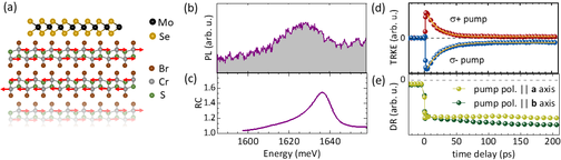 (a) Schematic picture of a typical van-der-Waals heterostructure, consisting of monolayer MoSe2, on top of a CrSBr crystal. (b) Photoluminescence, (c) reflectance contrast, (d) time-resolved Kerr ellipticity, and, (e) transient differential reflectivity experiments in the spectral region of the optical bandgap of MoSe2.