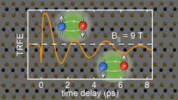 | Time-resolved Faraday ellipticity experiment on a WSe2 multilayer in an in-plane magnetic field, showing pseudospin quantum beats. An artistic view of the multilayer is projected in the background. | |