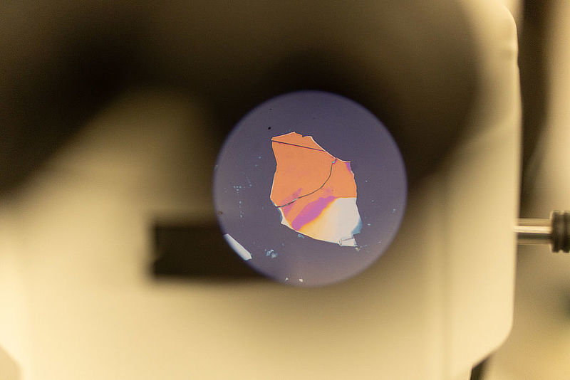 Fig. 2 | Left: Microscope image of MoSe2/WSe2 heterostructure. Right: Polar plot of second-harmonic generation intensities for the determination of the crystal orientations of the constituent layers. A twist angle of about 5° between the MoSe2 and WSe2 layers can be determined.