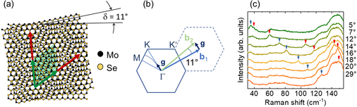 Fig. 1 | (a) Schematic picture of a twisted MoSe2 homobilayer. The green arrows and the green-shaded area mark the moiré supercell, while the red arrows outline the crystallographic supercell. (b) Hexagonal Brillouin zone of layer 1, with reciprocal basis vectors b1 and b2 of the two twisted layers 1 and 2. g is the reciprocal lattice vector of the moiré superlattice. (c) Low-frequency Raman spectra of a series of twisted MoSe2 homobilayers. The small arrows mark moiré phonons.