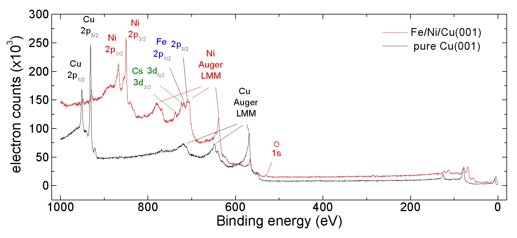 Photoelectrons are generated by illuminating the samples to be investigated with X-Rays. The emitted photoelectrons are collected and analyzed with respect to their intensity and energy distribution. The chemical sensitivity of this measurement technique is given by the element-specific distribution of binding energies of the electronic core levels leading to characteristic energy spectra. The presented X-Ray Photoemission Spectra is taken from a clean Cu crystal as well as ultra thin Fe (~2 mono layers) and Ni (9 mono layers) films on the same Cu crystal featuring separated peaks which belong to individual elements. XPS is - due to the short mean free path (1-4nm) of the excited photoelectrons - rather surface sensitive, as can be recognized by the reduction of the Cu peaks in the spectra in the case of ~11 atomic layers of Fe and Ni on top of the Cu substrate. XPS is highly sensitive to metals.
