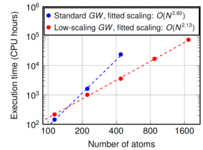 The GW method is the state-of-the-art method implemented in scientific software to compute electronic band structures in solids and electronic level energies in molecules. Today's largest supercomputers are required, when applying GW to unit cells or molecules containing 10-100 atoms which is often required to model large molecules, liquids, interfaces or nanostructured materials. A reason for the high computational cost of GW is the unfavorable increase of computing time in GW with the fourth power of the number of atoms in the simulation, see the blue dots in the lower figure.