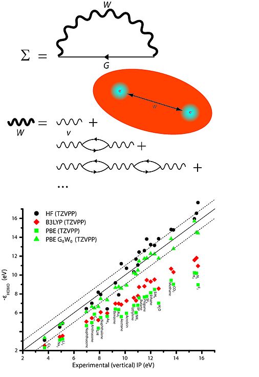 Top: The GW self-energy diagram, bottom: GW quasi-particle levels compared to experimental ionization potentials.