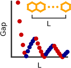 ![]() The optical gaps of oligoacenes show incommensurate oscillations as a function of length. | Basic oligacenes (benzene, naphthalene, anthracene, ...) are well known molecules, which consist of linearly fused benzene rings. We have shown that the honey-comb-like arrangement of carbon bonds leads to a surprising periodicity of the properties of oligoacenes, as we keep adding more and more rings. We argue that this is a natural consequence of the band structure of the infinite chain (polyacene), having a relativistic dispersion close to the Fermi points. |