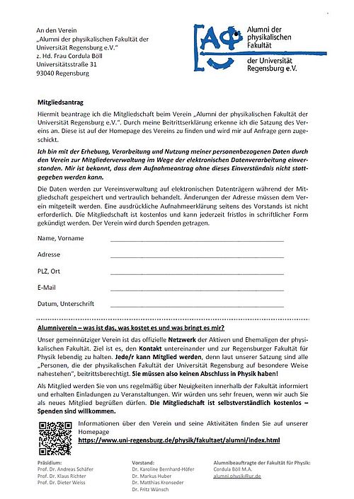 Beitrittsberechtigt sind laut unserer Satzung alle "Personen, die der physikalischen Fakultät der Universität Regensburg auf besondere Weise nahestehen". Sie müssen also nicht unbedingt hier studiert haben - ja, Sie müssen nicht einmal unbedingt Physikerin oder Physiker sein :)