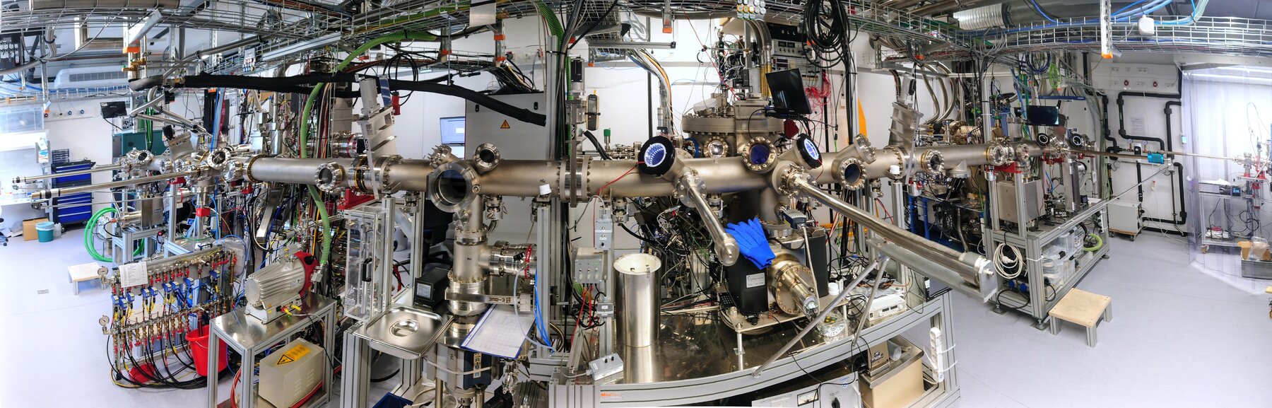 The evaporation and sample treatment techniques range from thermal evaporation in the form of Knudsen cells, electron-beam evaporators, via sputtering sources and an oxygen-plasma source for oxidation during evaporation to Ar-ion-bombardment for cleaning issues. All MBE systems are equipped by a reflection high energy electron diffraction (RHEED) system and in the transfer chamber a low energy electron diffraction (LEED) system is installed. Further, a vacuum transport chamber can be attached to the system allowing for in-situ transfer to different chambers at the faculty or even at other institutions on different sample holders.